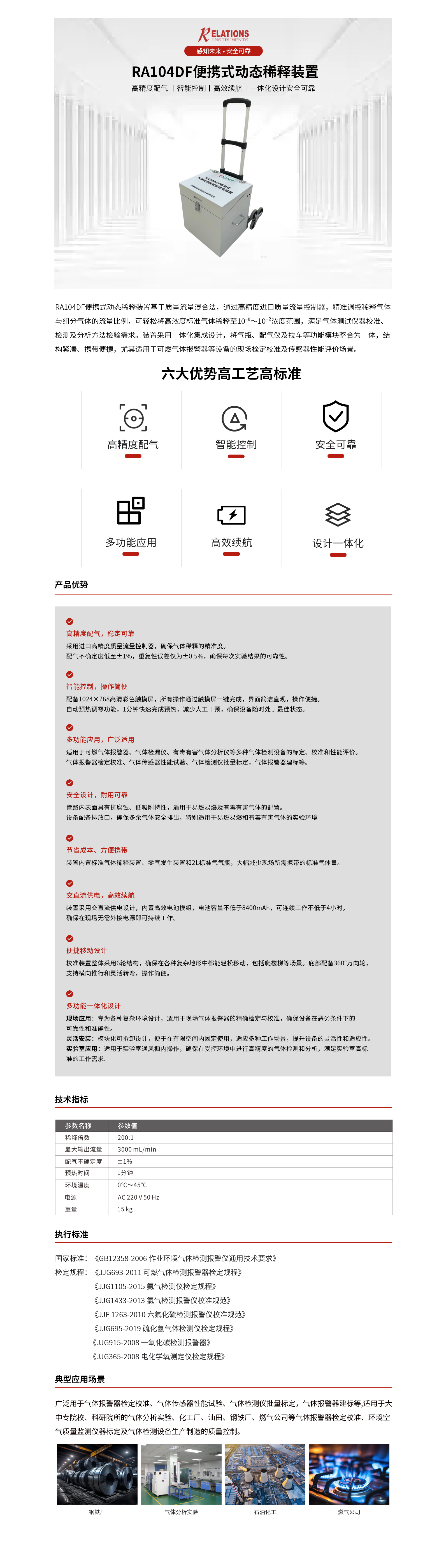 RA104DF便攜式動(dòng)態(tài)稀釋裝置基于質(zhì)量流量混合法,通過(guò)高精度進(jìn)口質(zhì)量流量控制器,精準(zhǔn)調(diào)控稀釋氣體與組分氣體的流量比例,可輕松將高濃度標(biāo)準(zhǔn)氣體稀釋至10??~10?2濃度范圍,滿足氣體測(cè)試儀器校準(zhǔn)、檢測(cè)及分析方法檢驗(yàn)需求。裝置采用一體化集成設(shè)計(jì),將氣瓶、配氣儀及拉車等功能模塊整合為一體,結(jié)構(gòu)緊湊、攜帶便捷,尤其適用于可燃?xì)怏w報(bào)警器等設(shè)備的現(xiàn)場(chǎng)檢定校準(zhǔn)及傳感器性能評(píng)價(jià)場(chǎng)景。